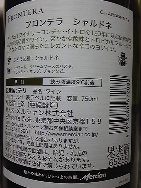 フロンテラ シャルドネ 白。チリワインです。しかもスーパーででら安いワインなのだ。